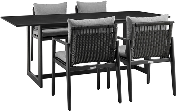 Dine outdoors and soak up the scenery with the Cayman Outdoor 5-Piece dining set from Armen Living. The Cayman dining set includes 4 outdoor chairs with cushions and 1 rectangular patio dining table. Rattan is intricately hand-woven around the back of the seat to serve as a unique and elegant detail and features ergonomic properties to keep your back properly aligned.Read More