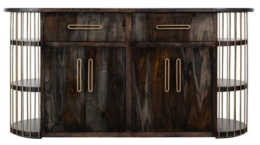 Six open shelves, supported by gold-aged metal bars, serve as a display for your favorite kitchenware and pantry items, while four doors and two deep drawers help keep your kitchen organized.
